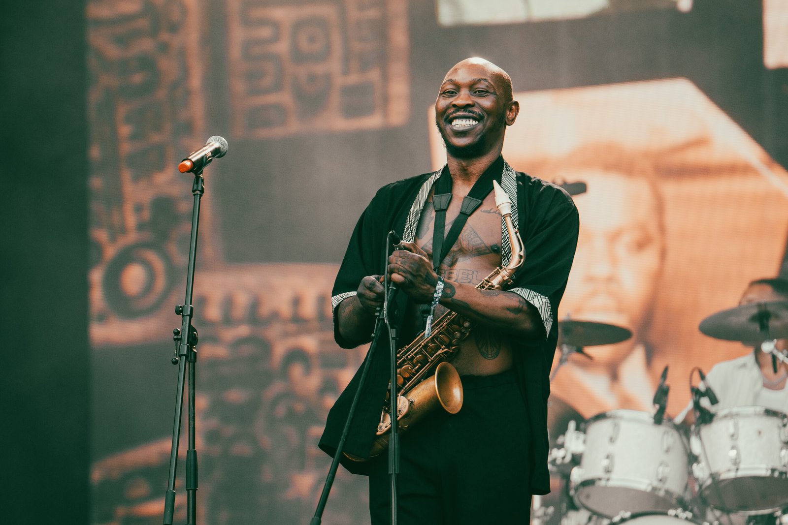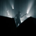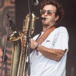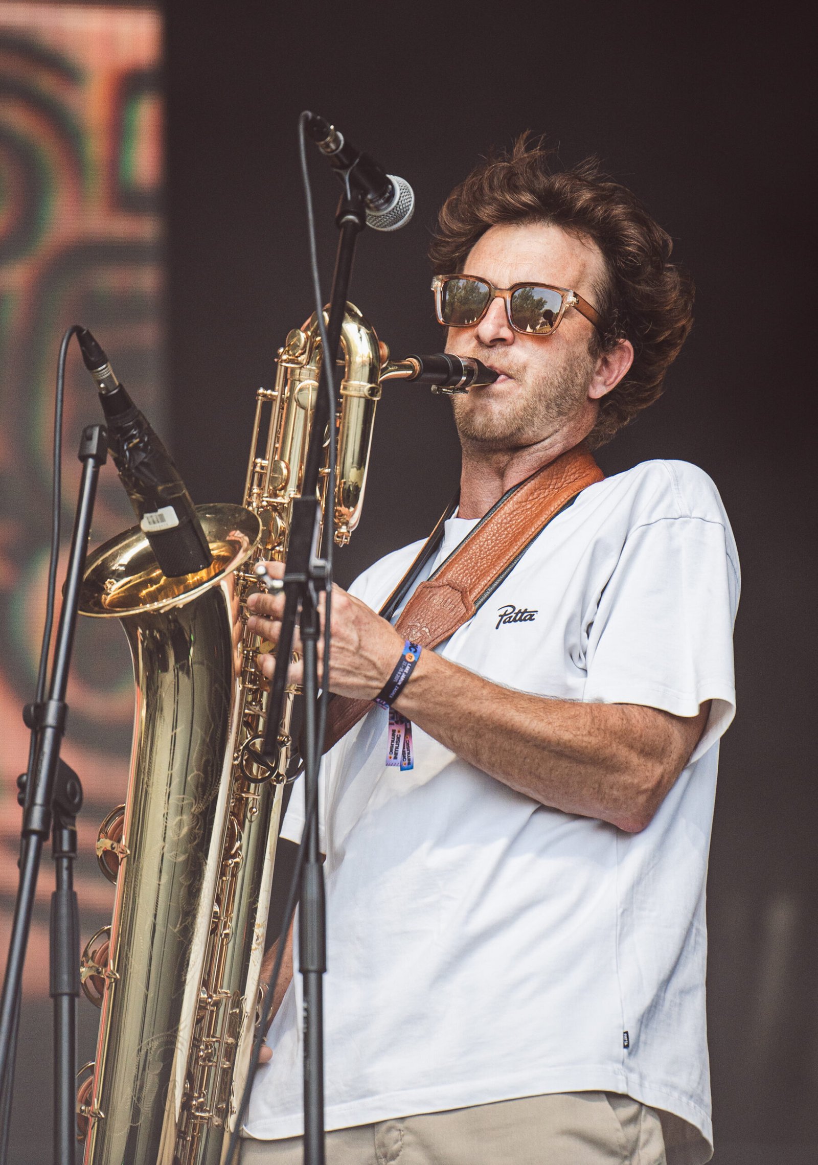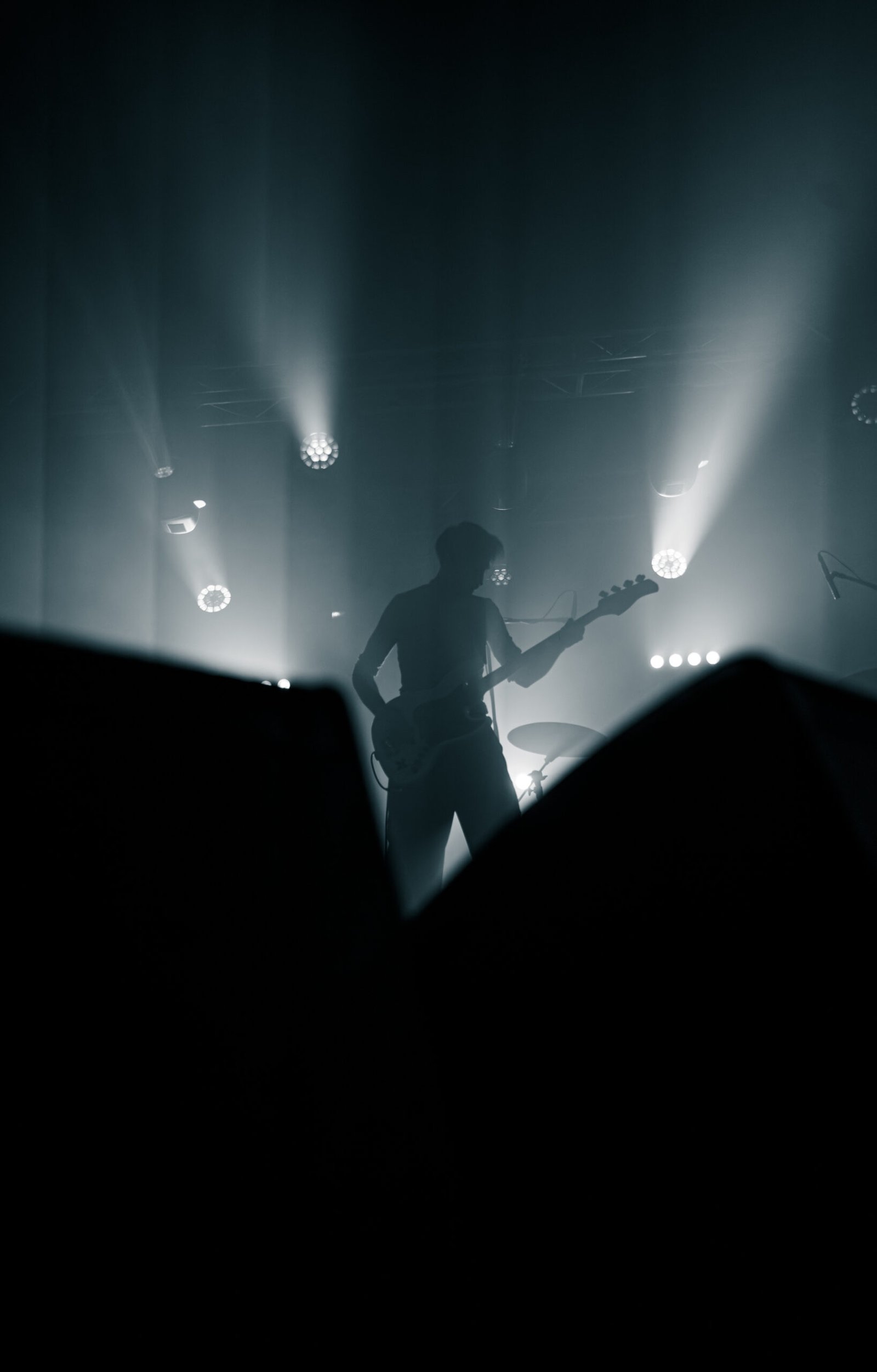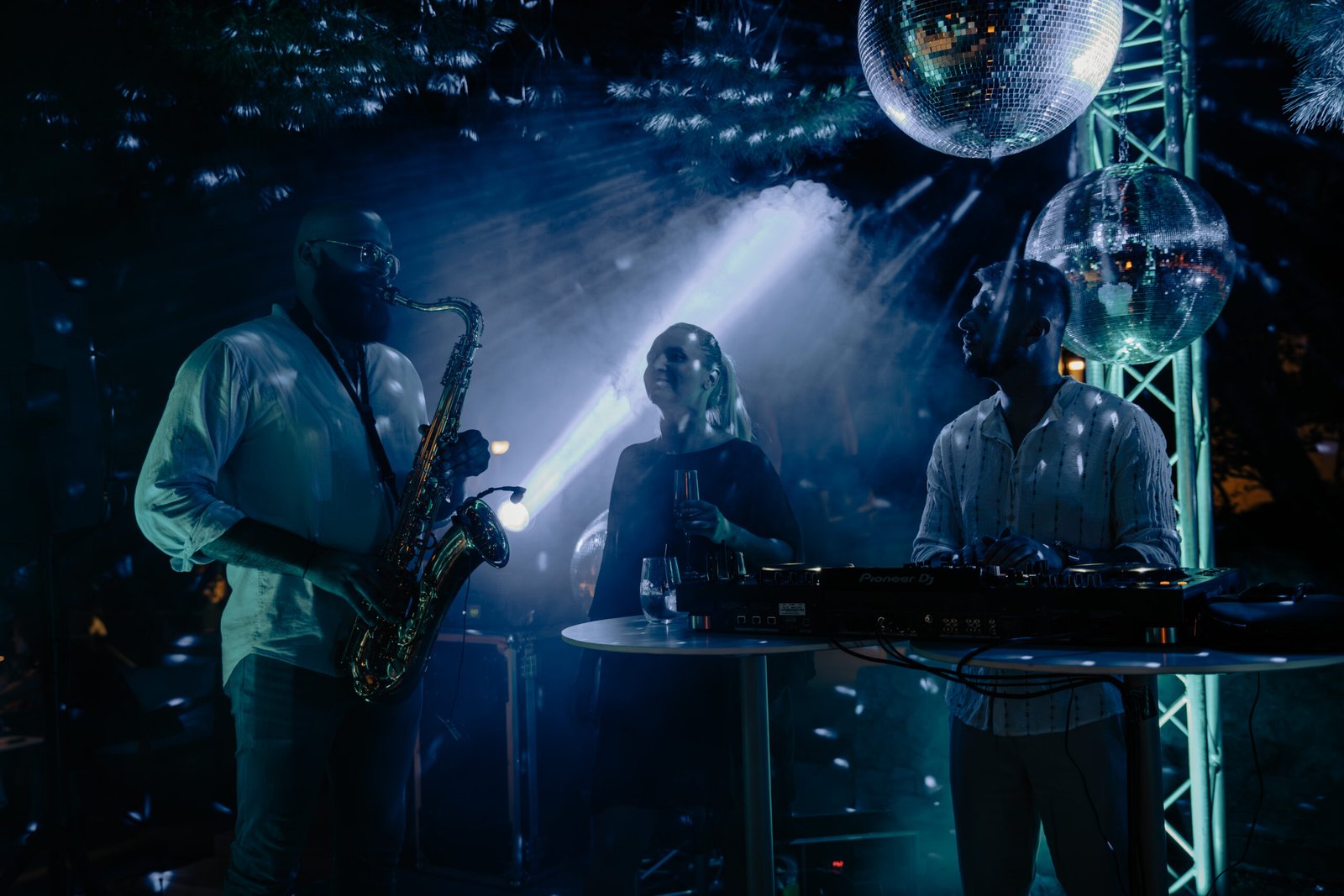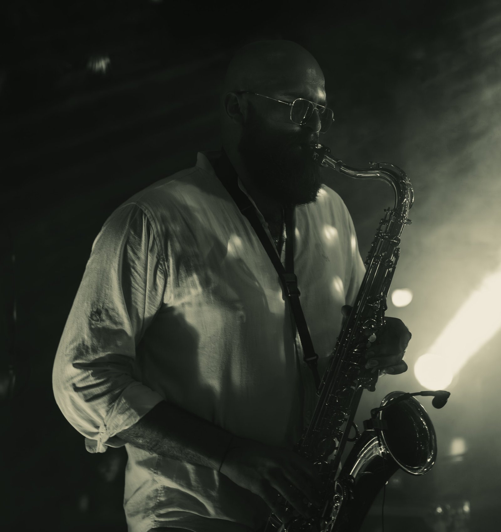 Crno-bijela fotografija saksofonista na pozornici, s blagim zelenkastim nijansama, stvarajući dramatičnu atmosferu tijekom nastupa
