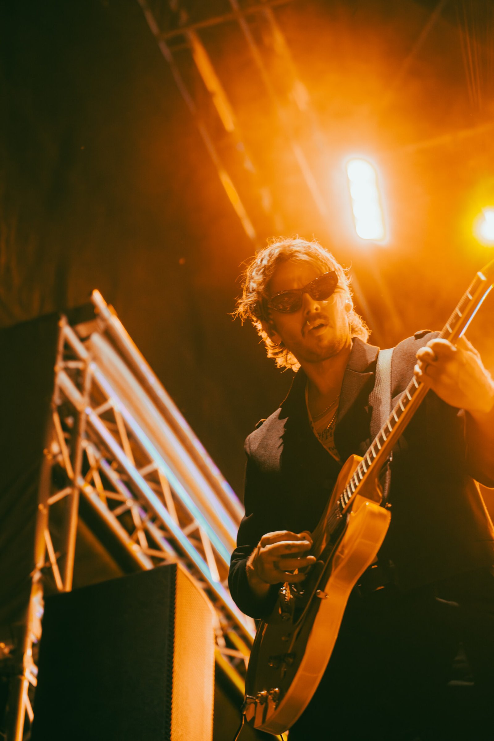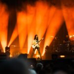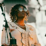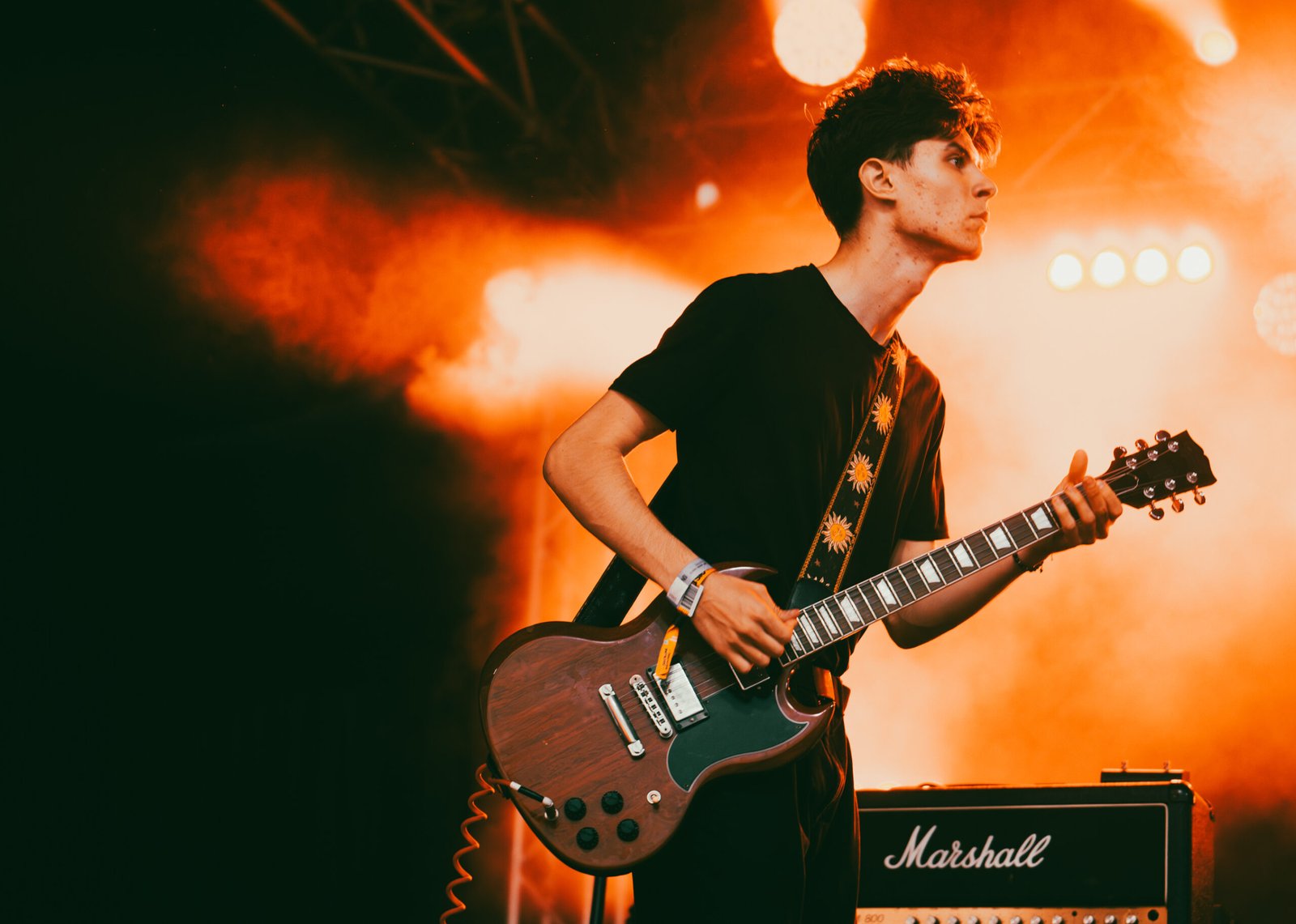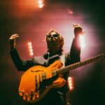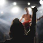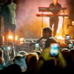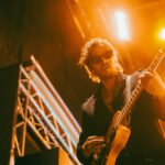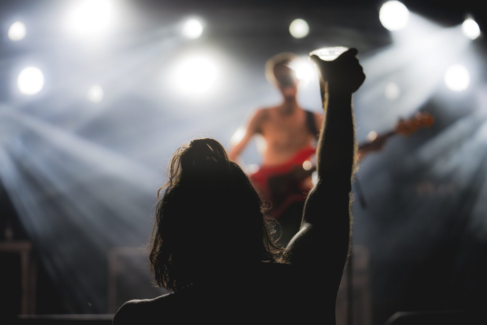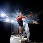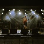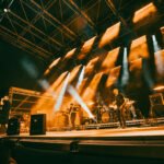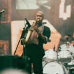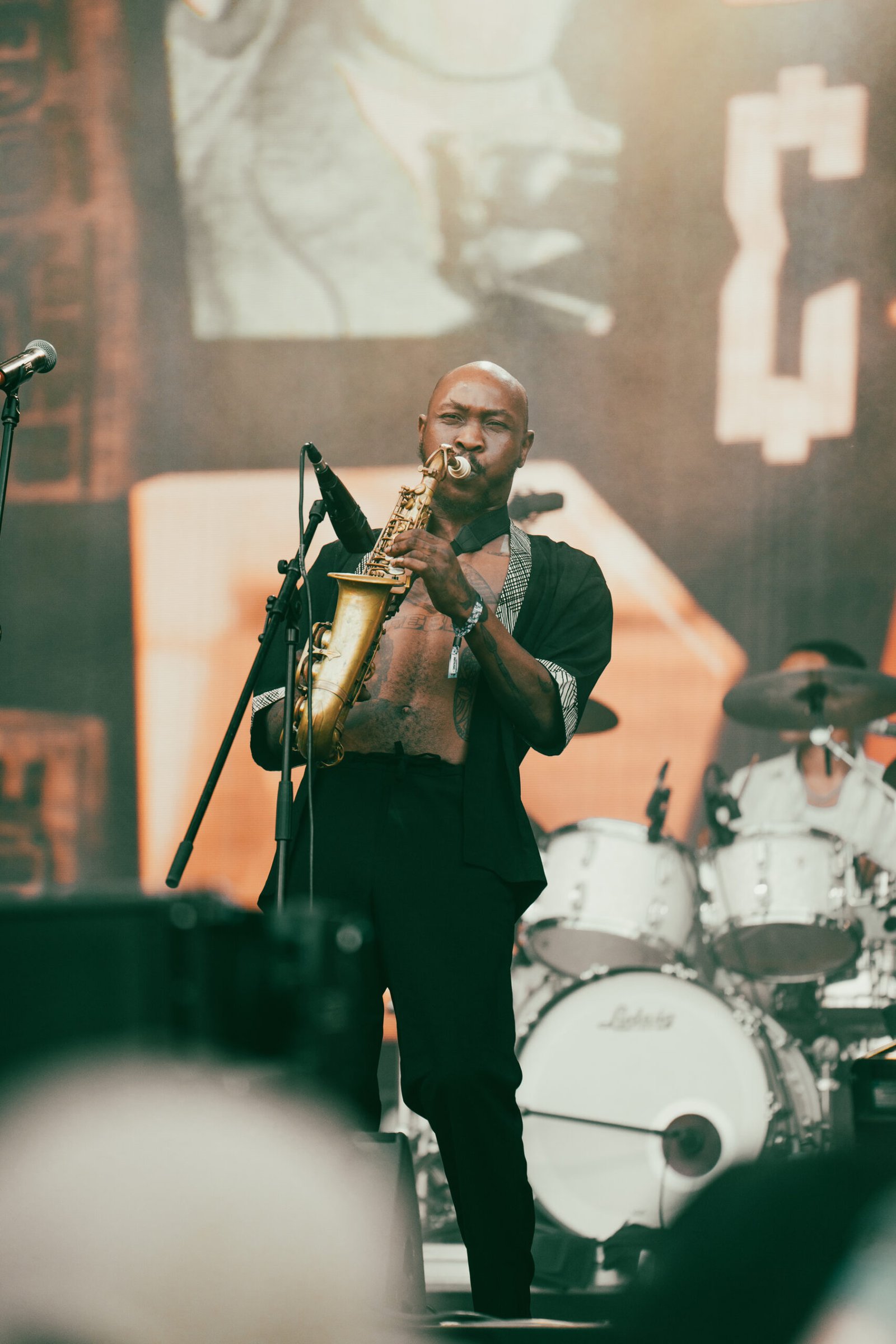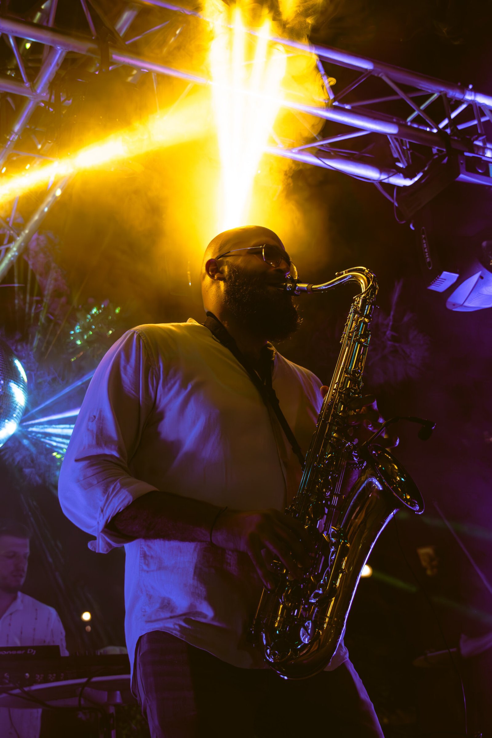 Saksofonist na pozornici iz donje perspektive sa zlatnim svijetlom iznad njega